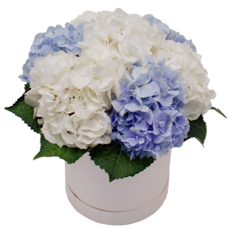 Букет состоит из 4 белые гортензии, 3 голубые гортензии, зелень, коробка, оазис.