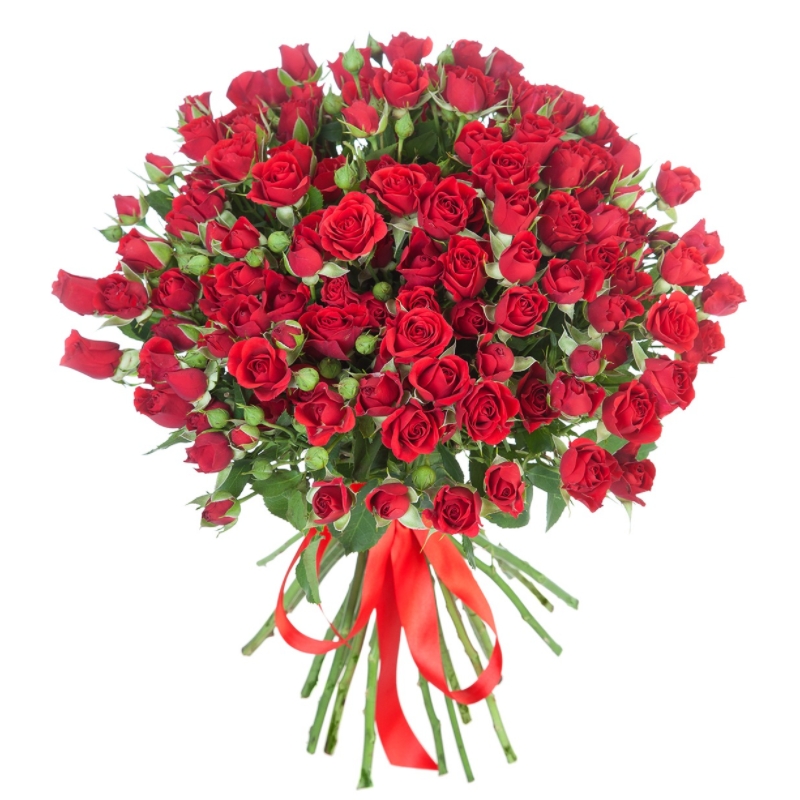 Букет состоит из 17 красных кустовых роз, прозрачная упаковка, атласная лента.