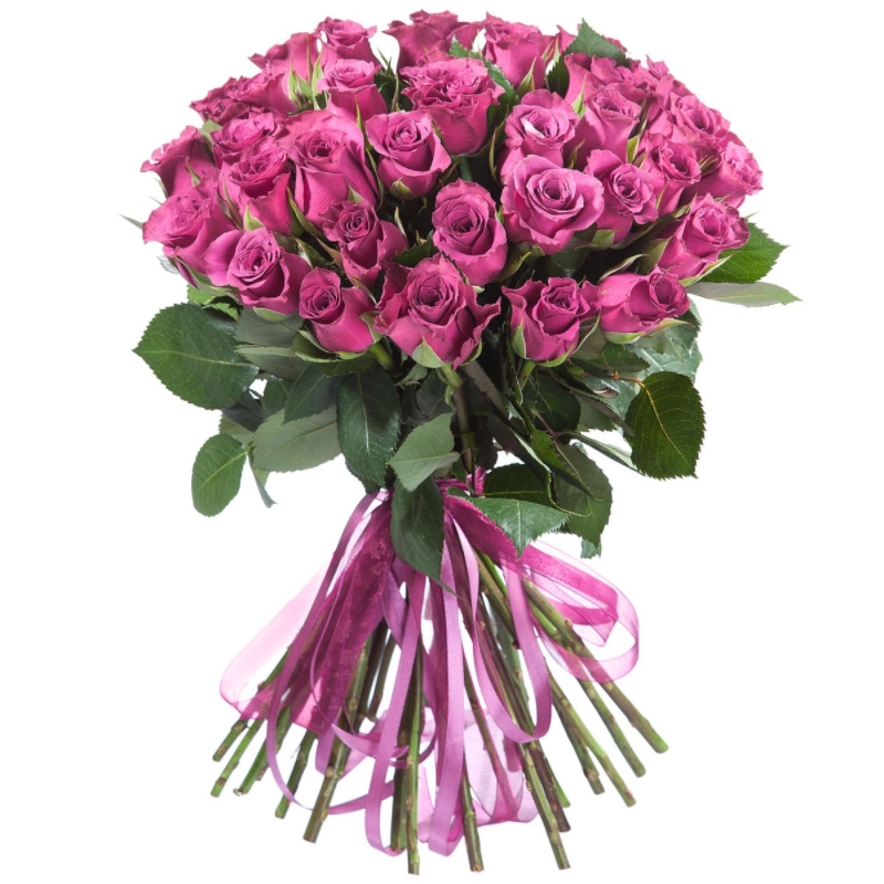Букет состоит из 35 розовых роз, прозрачная упаковка, атласная лента.