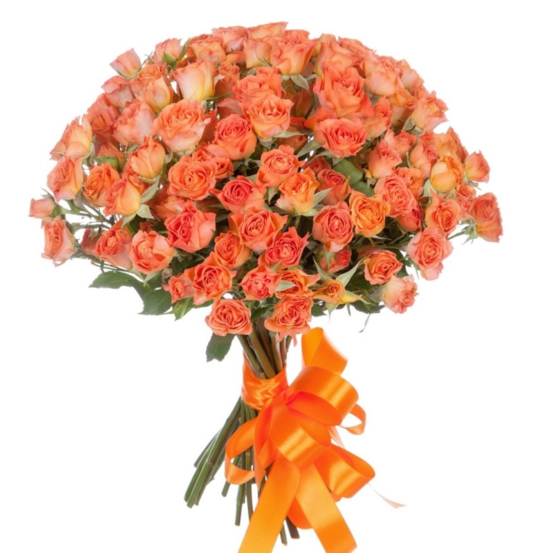 Букет состоит из 21 оранжевая кустовая роза, прозрачная упаковка, атласная лента.